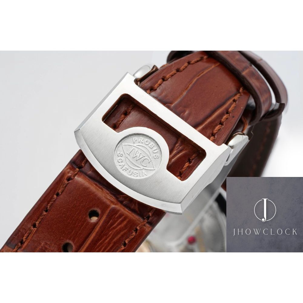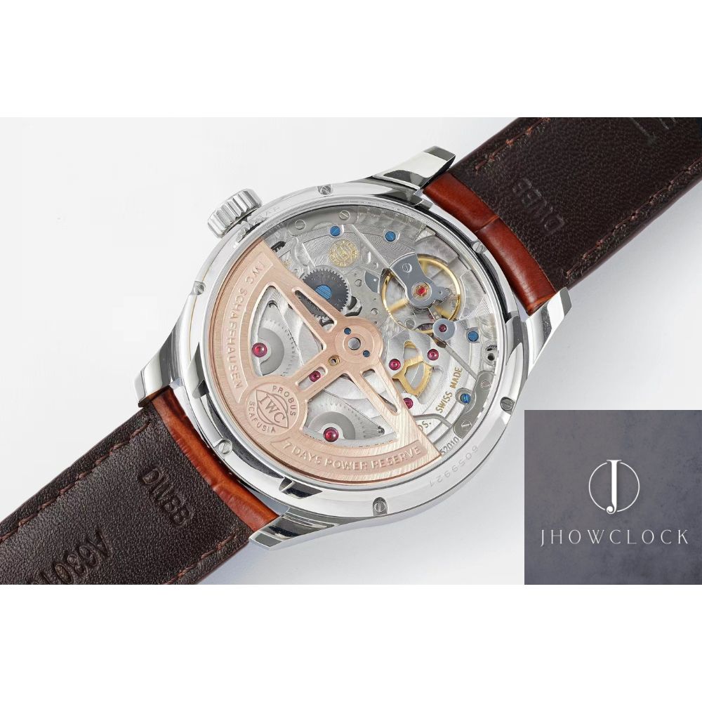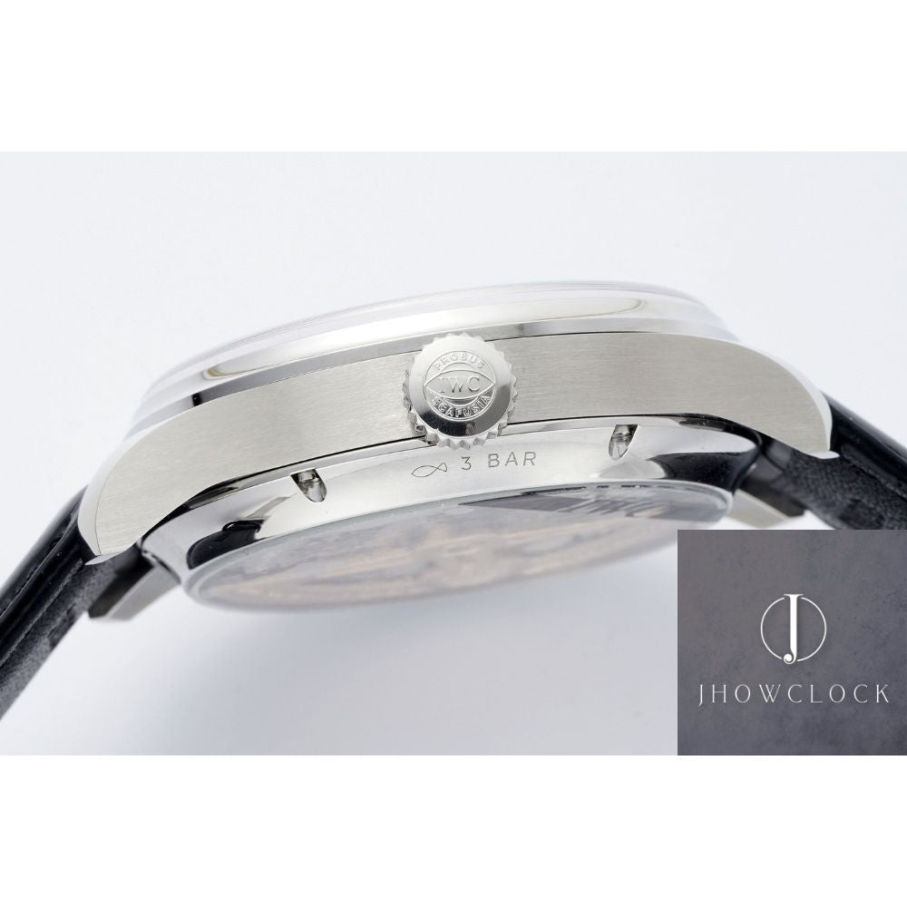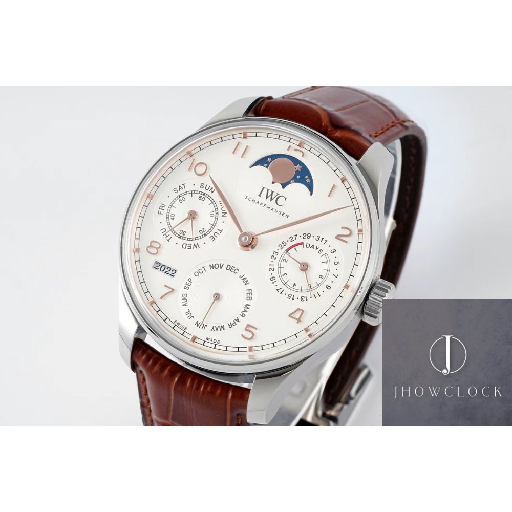 - Desempenho de movimento impressionante:Com um tamanho de 42,2 mm x 14,9 mm, o relógio está equipado com um movimento base da série portuguesa, garantindo uma estabilidade eficiente e uma reserva de marcha de mais de 72 horas. Incorpora um complexo módulo de calendário perpétuo, permitindo sincronizar todas as funções com o original e permitindo ajustes através da coroa.