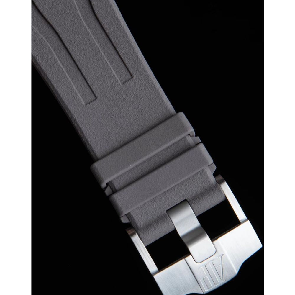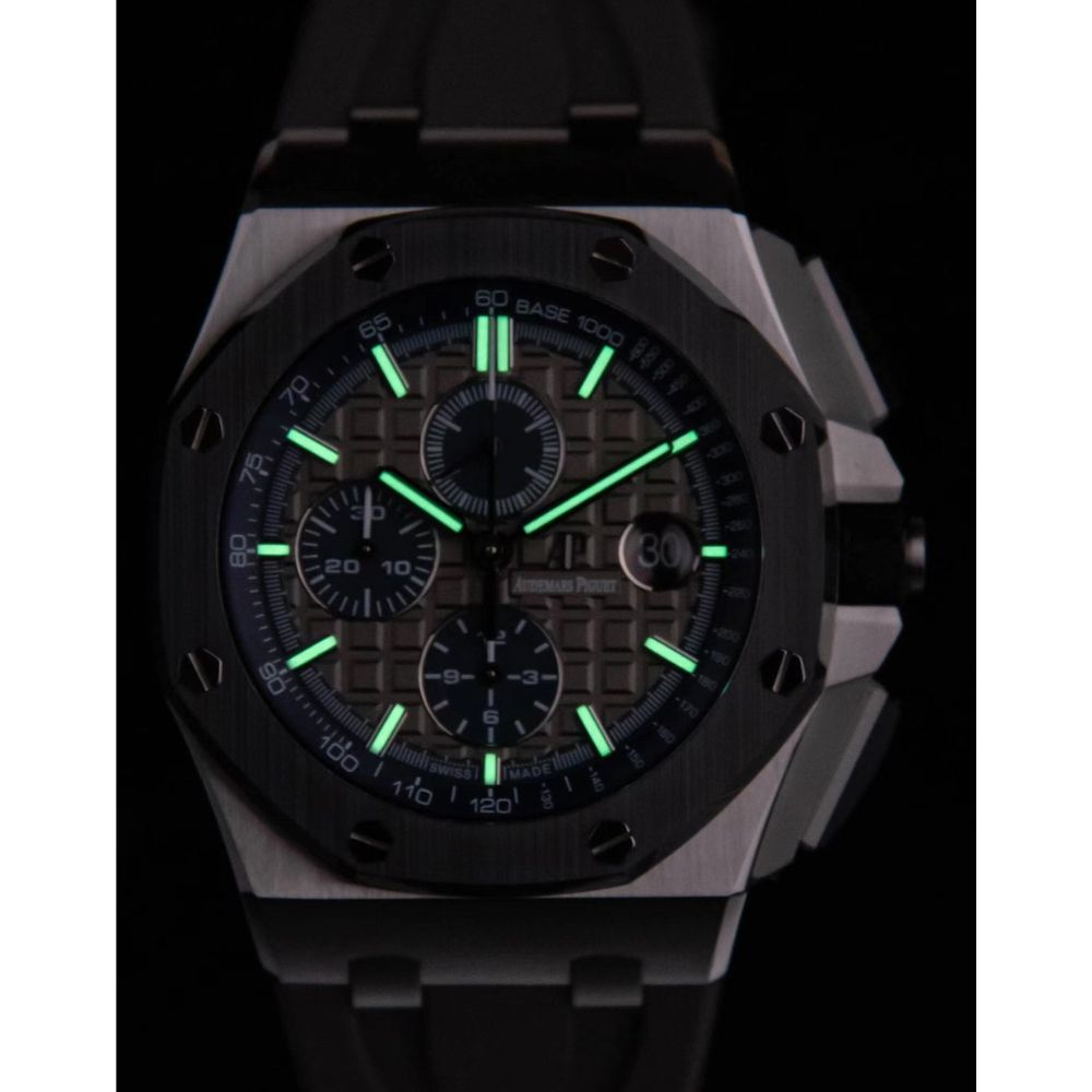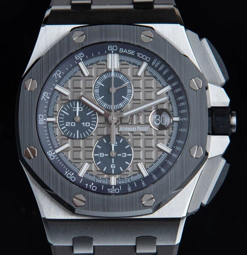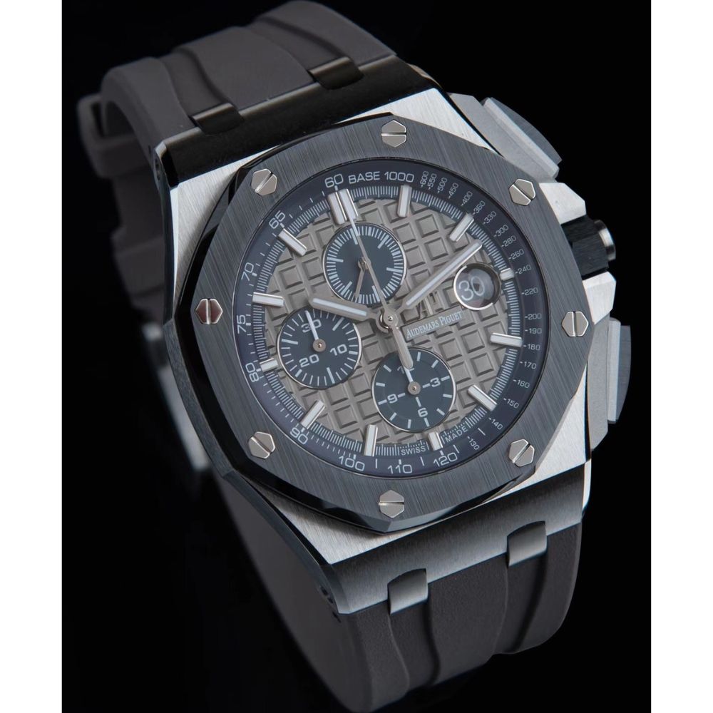 - Mostrador xadrez grande clássico: O mostrador apresenta o icônico padrão xadrez grande da Audemars Piguet como plano de fundo, organizado em um design de grade bem definido. Foi perfeitamente polido para refletir totalmente a habilidade dos artesãos habilidosos envolvidos.