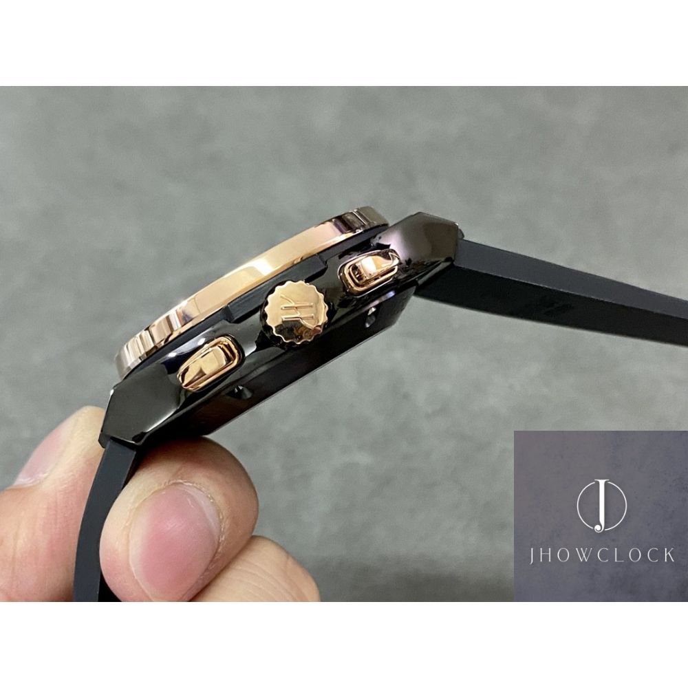Design requintado: 45 mm de diâmetro, caixa em aço inoxidável 316L, vidro de safira resistente ao desgaste, equipado com movimento de cronógrafo multifuncional importado 7750, que restaura todas as funções originais, incluindo o ponteiro pequeno de 24 horas às 3 horas, o ponteiro pequeno do cronógrafo às 9 horas e o exclusivo mostrador do calendário às 6 horas.