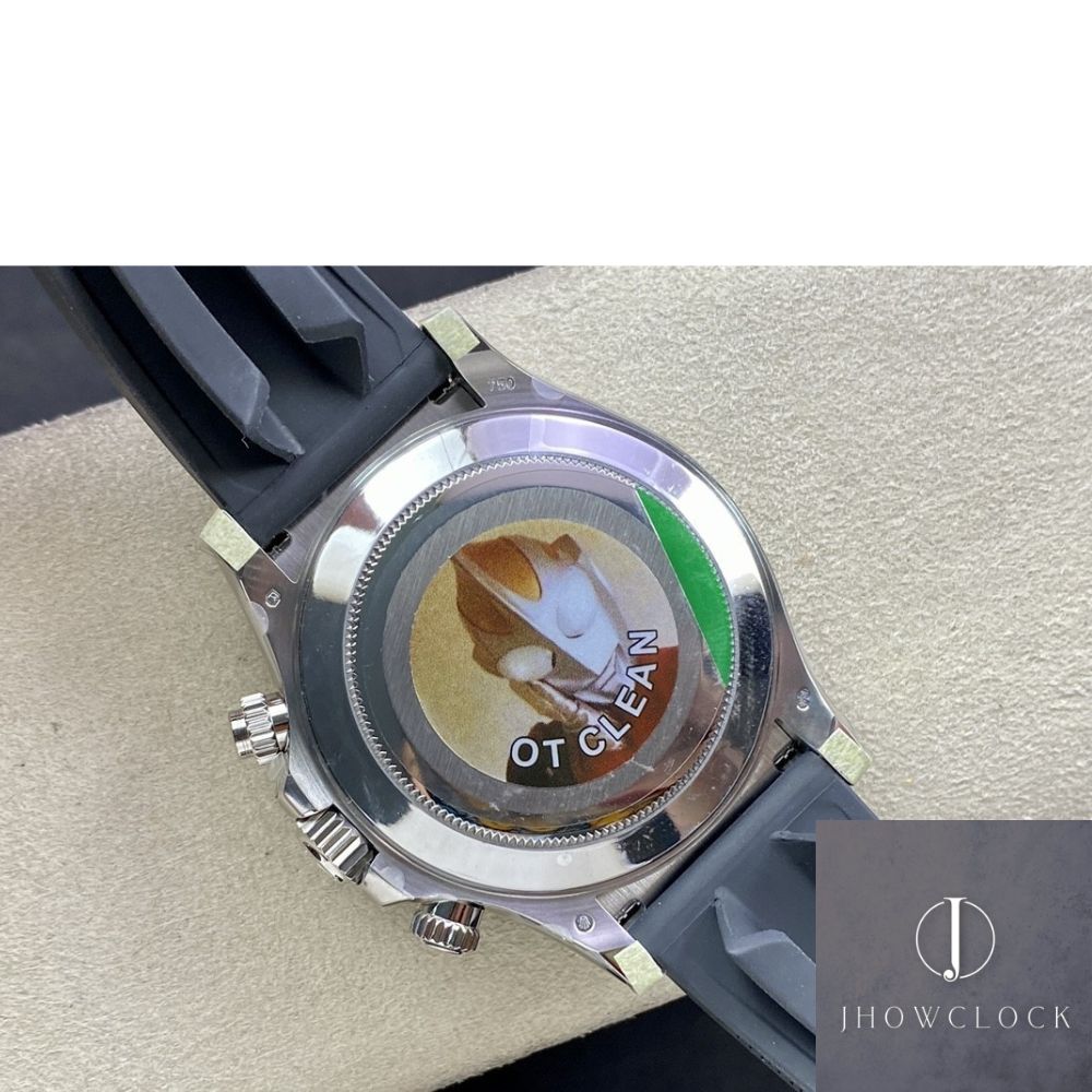 O falso relógio Rolex Daytona da Clean Factory apresenta material 904L, movimento 4130, pulseira AR, mostrador limpo/edição exclusiva, anel de cerâmica limpo e ponteiros de fábrica polidos, com espessura de 12,2-12,3.