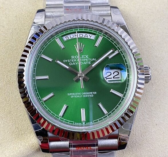 - Design diferenciado: Apresentando um mostrador verde que adiciona um toque único e luxuoso ao modelo clássico Day Date.
