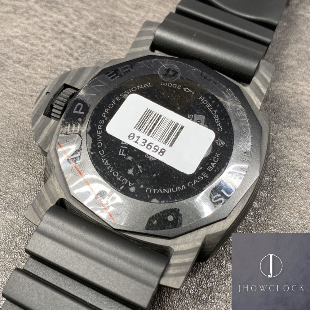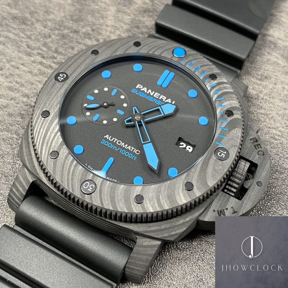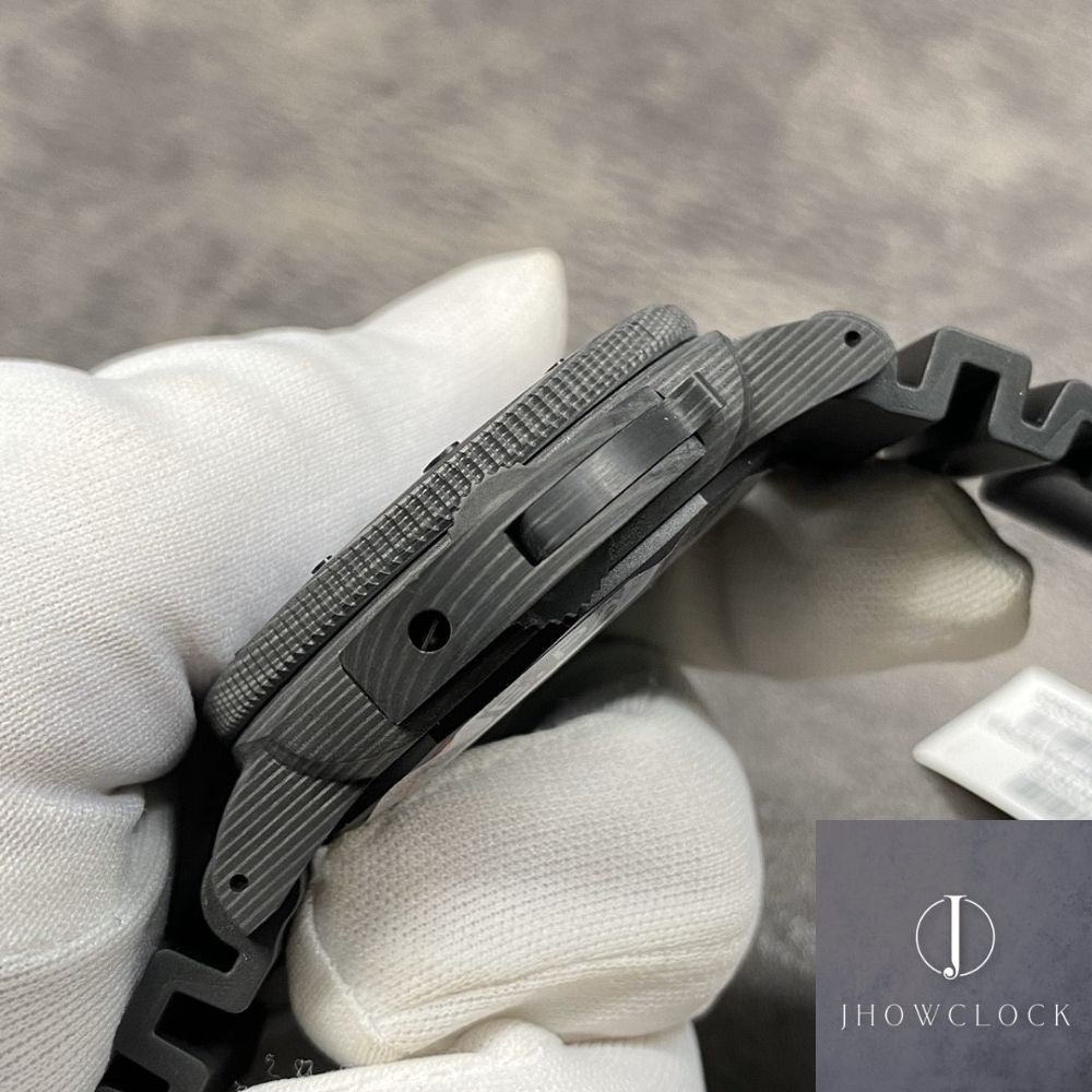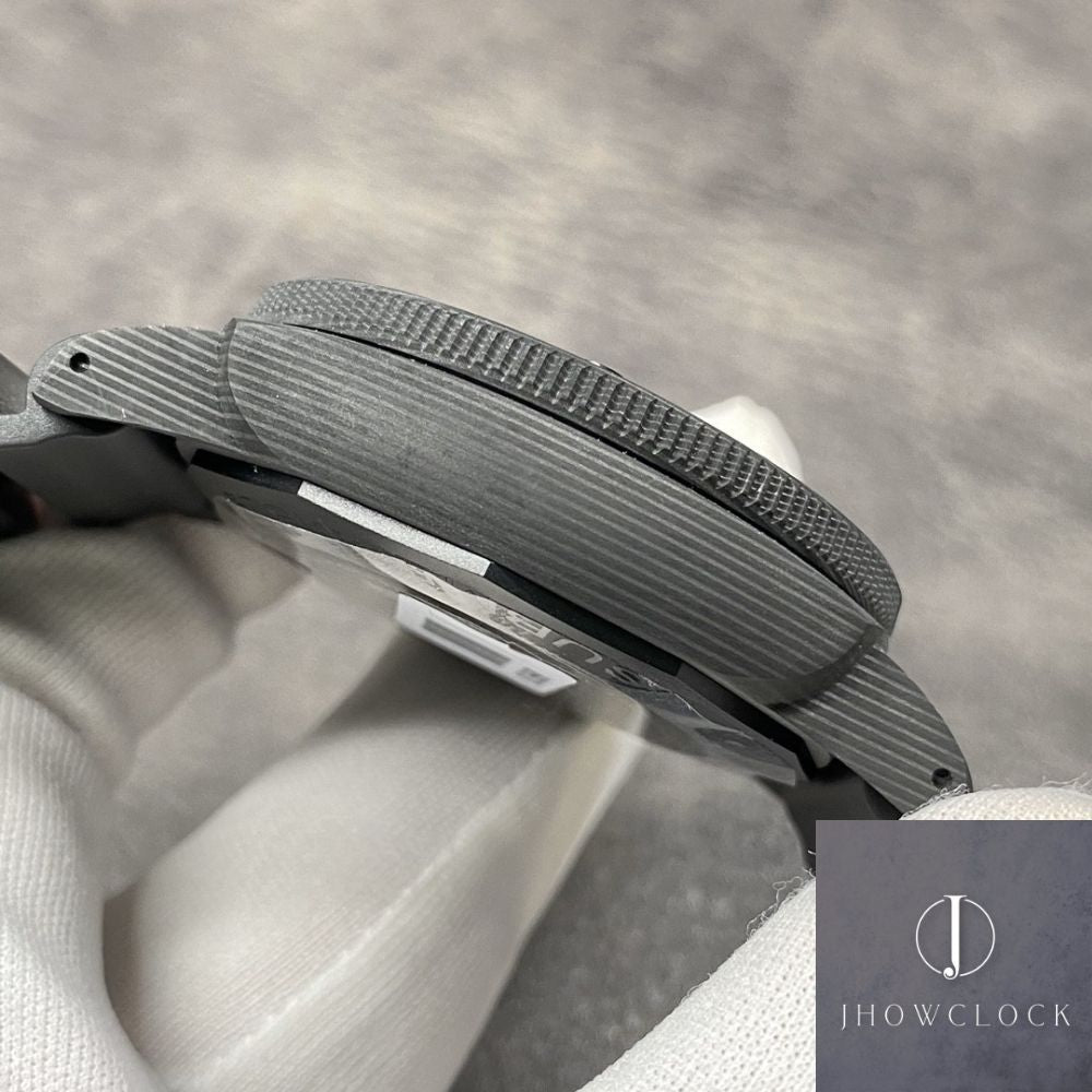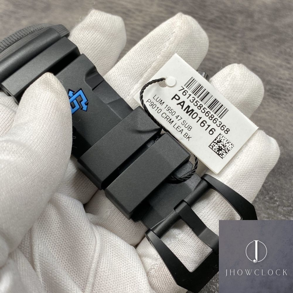 O PAM01616 apresenta uma caixa de relógio de fibra de carbono com uma luneta de contagem regressiva do medidor de mergulho adornada com linhas de escala azul. O espelho de safira oferece durabilidade e clareza, enquanto a tampa inferior preta PVD de liga de titânio garante proteção adicional. A coroa da ponte é gravada com o padrão submersível, aumentando seu apelo único.
