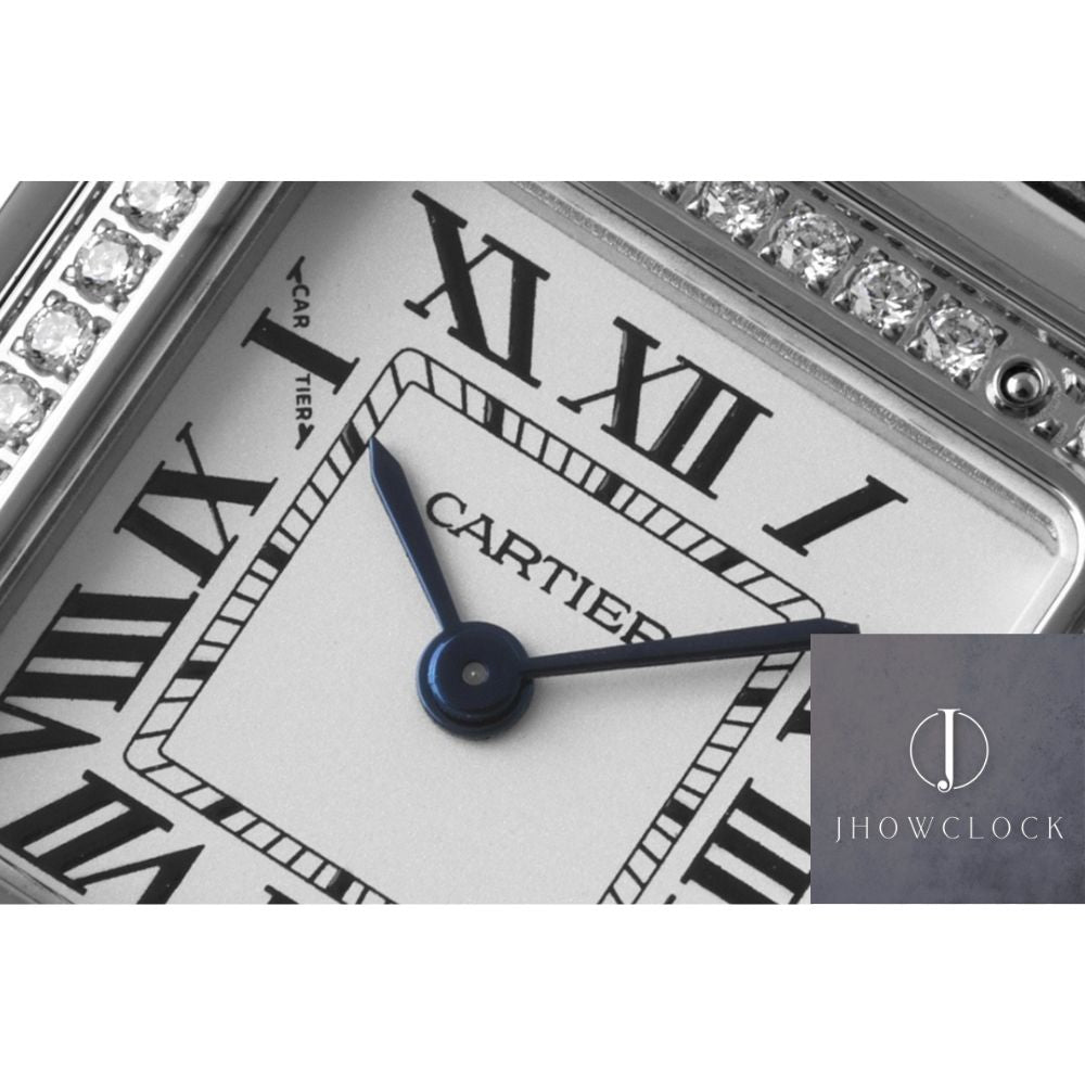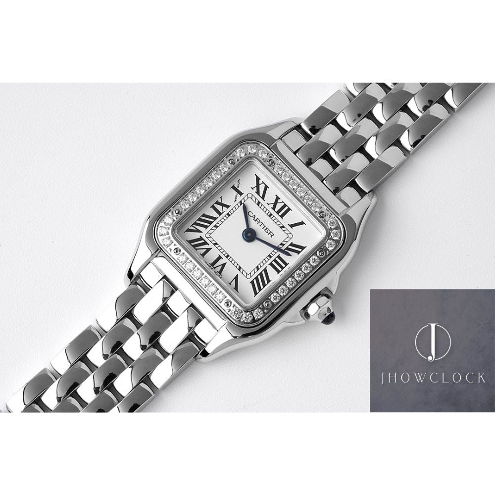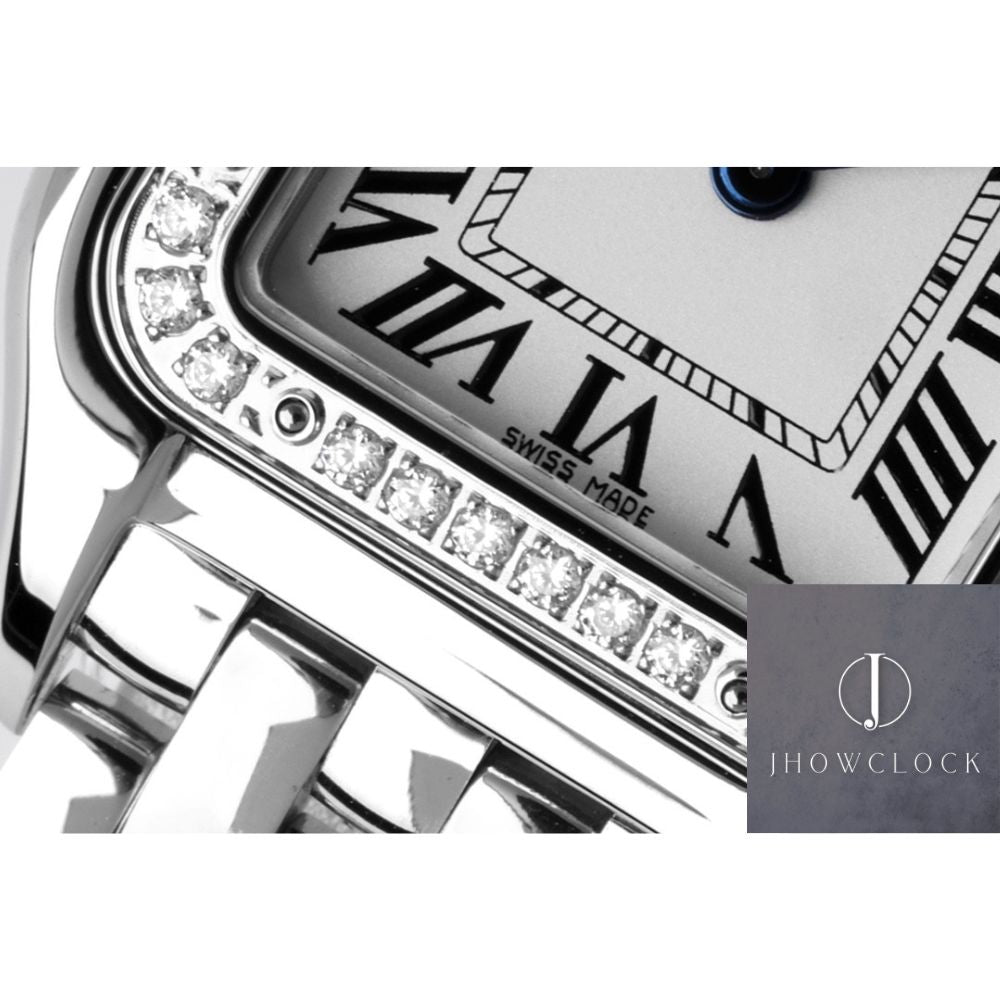 - Design do mostrador: O mostrador branco prateado é uma marca registrada da coleção Panthère da Cartier, exalando elegância atemporal. O mostrador apresenta os icônicos marcadores de horas em algarismos romanos no estilo Cartier, realçando o charme e a herança distintos da marca.