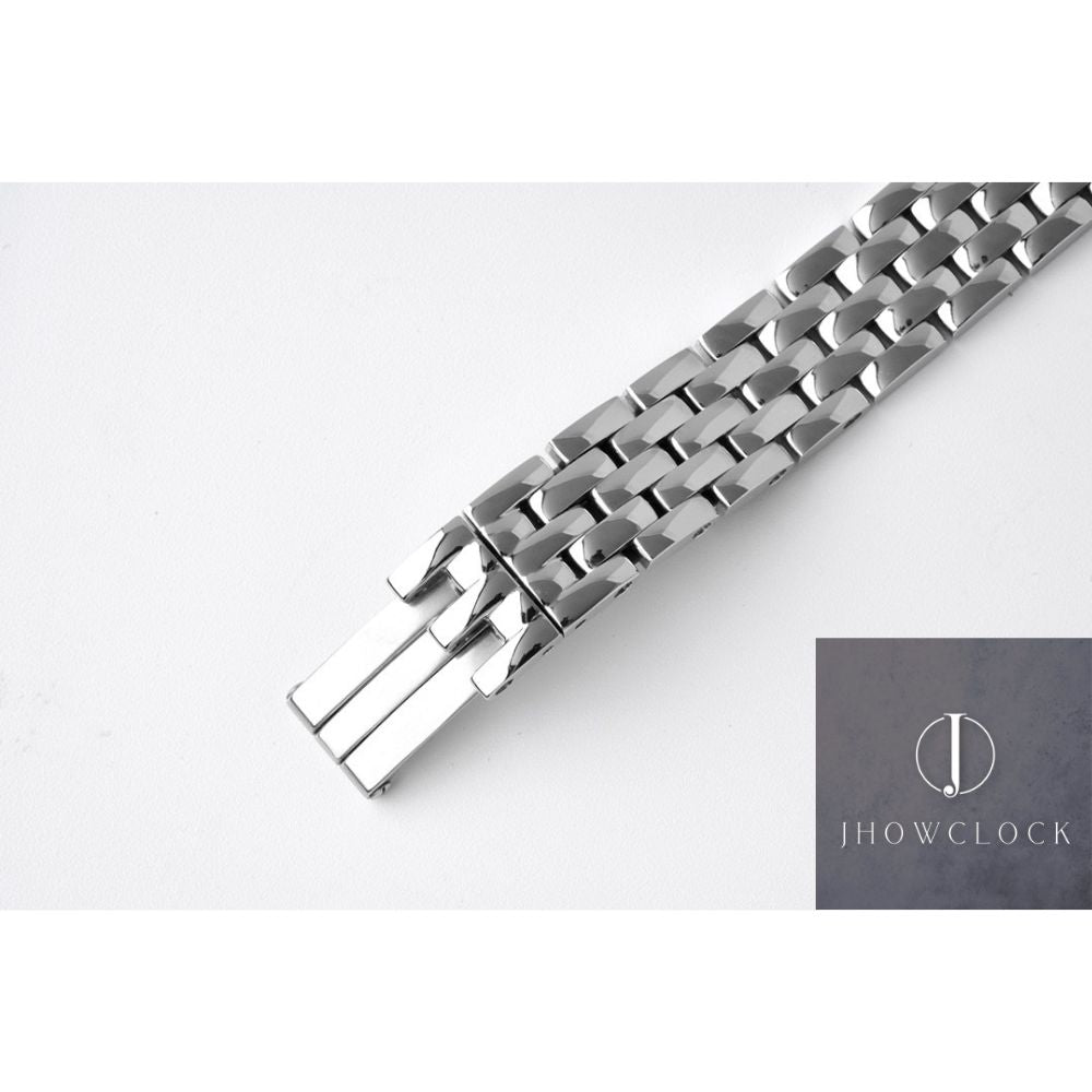 - Design de pulseira: O relógio está equipado com uma pulseira de elos flexíveis feita de aço fino 316 polido, que capta a luz de forma brilhante. Esta pulseira não apenas complementa o design da caixa, mas também garante um ajuste confortável, oferecendo estilo e funcionalidade. O design da pulseira exala um ar de sofisticação, tornando-a um acessório ideal para qualquer guarda-roupa.