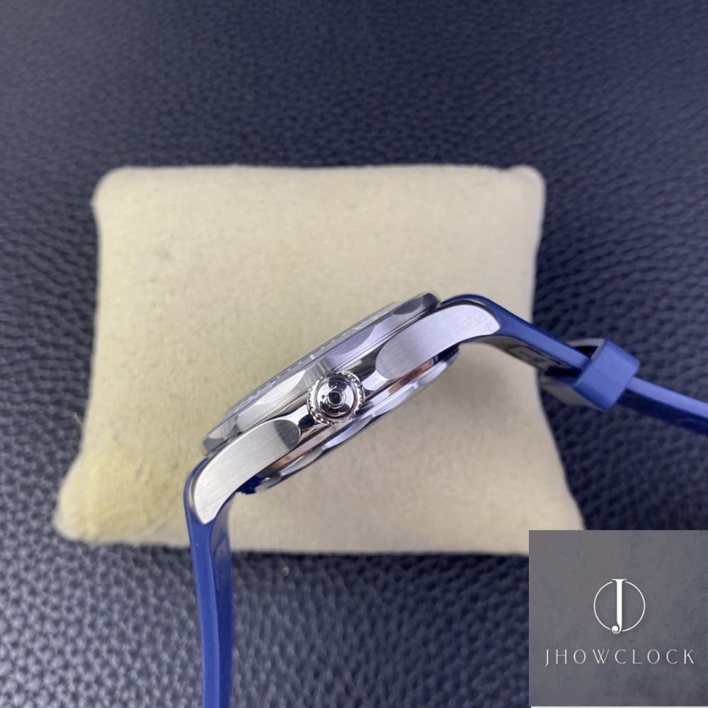 - O relógio possui uma caixa de aço inoxidável de 42 mm, complementada por um mostrador de cerâmica azul lindamente gravado com um padrão ondulado. Os marcadores de horas e os ponteiros são revestidos com Super-LumiNova branca, garantindo excelente visibilidade em qualquer condição de iluminação. Posicionada às 6 horas, uma janela de calendário adiciona praticidade ao design. A luneta giratória unidirecional também é feita de cerâmica azul, adornada com uma escala de mergulho em esmalte branco, harmonizando-se perfeitamente com a estética geral. Todos os logotipos, assinaturas e outros detalhes no mostrador são apresentados em branco, criando uma paleta de cores puras que realça a beleza do azul.