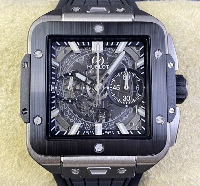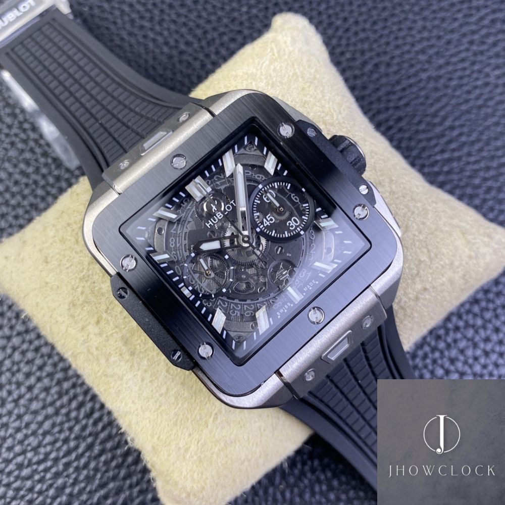 Este relógio falso de explosão quadrada Hublot é feito de titânio grau 5, que é leve e confortável. É equipado com uma face de safira de alta transparência e safiras em forma de ponte superior e inferior, mostrando uma estética de design única.