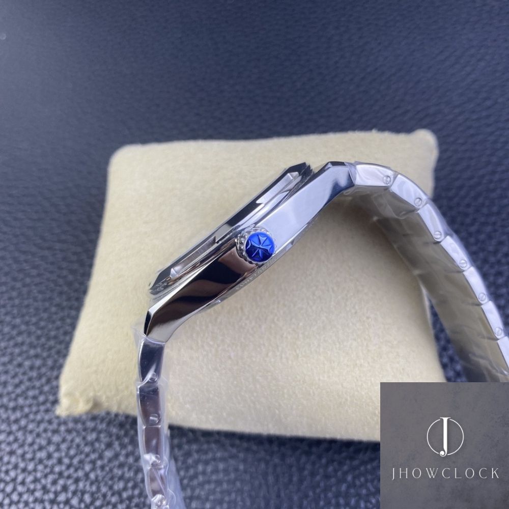 da caixa: A caixa de 41 mm em aço inoxidável tem linhas suaves e textura delicada e está perfeitamente conectada com a pulseira. A parte de trás é gravada com o logotipo da Cruz de Malta da Vacheron Constantin e é equipada com um dispositivo antimagnético e uma coroa rosqueada para garantir a precisão.