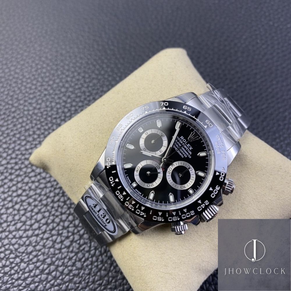 O falso relógio Rolex Daytona da Clean Factory apresenta material 904L, movimento 4130, pulseira AR, mostrador limpo/edição exclusiva, anel de cerâmica limpo e ponteiros de fábrica polidos, com espessura de 12,2-12,3.